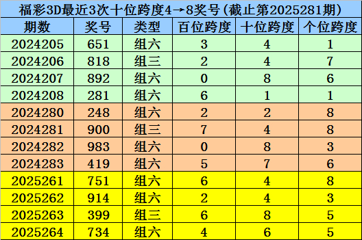首位跨度分析:首位号码最近3期奖号为7-4-8,不时两期跨度为3、4,历史上首位号码不时两期区分开出跨度3、4的情状共出现157次,其前两次开出奖号区分为: