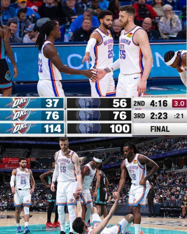 在孟菲斯的夜晚,雷霆用一场从谷底反弹的逆转,完成了这趟漫长的四连客征程。比分定格在114比100,雷霆在一度过期19分的情况下,靠着亚历山大的千里稳与爆发,硬生生把比赛的节拍再行拿了纪念。